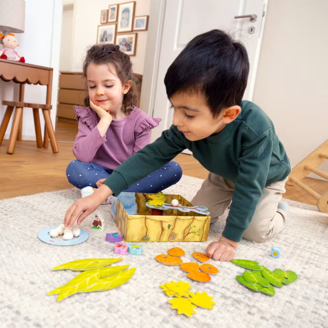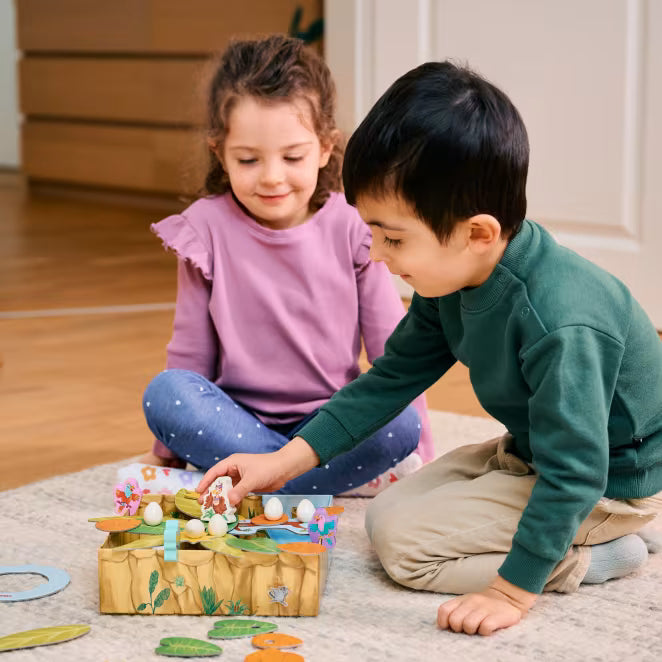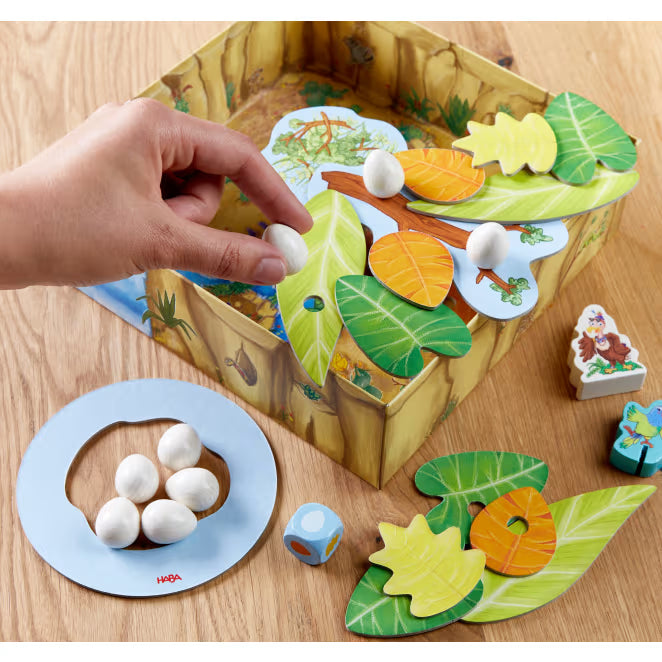 Es ist Zeit zum Eierlegen! Und Frau Geier ist besonders fleißig – gleich 8 große Eier sind es. Nur leider ist das Nest viel zu klein! Alle Kinder helfen gemeinsam, Frau Geier ein großes, stabiles Nest zu bauen. Doch die frechen Papageien warten nur darauf, dass etwas herunterfällt. Sind Frau Geier und ihre Eier im Nest eingezogen und das Nest hält, bevor sich der letzte Papagei breit macht, haben alle gemeinsam gewonnen.