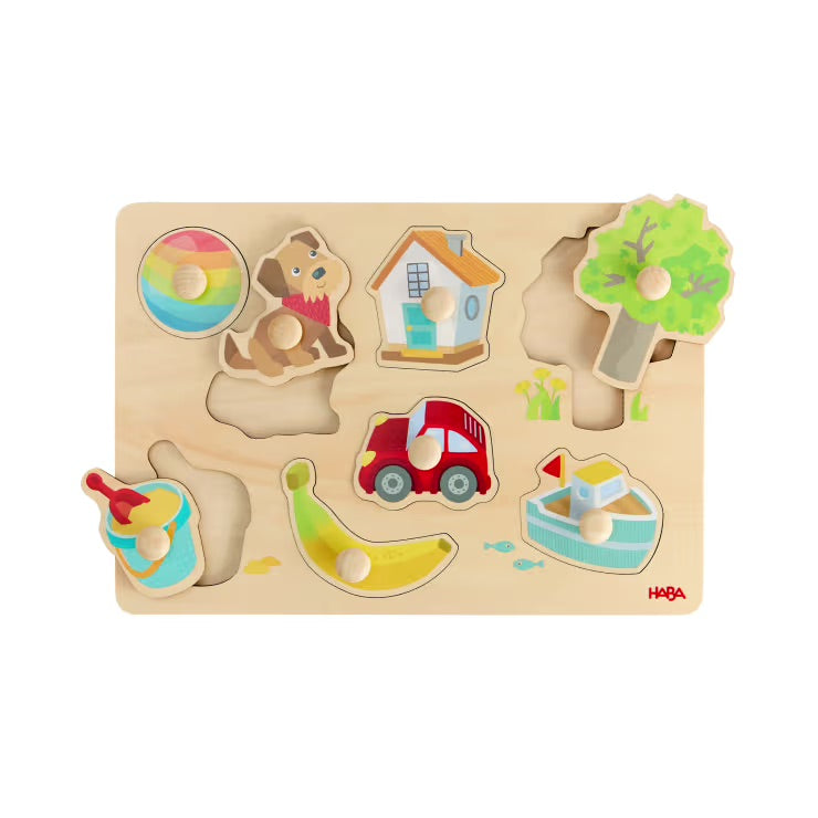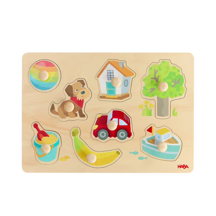 Erste Wörter „begreifen“ – spielend einfach mit diesem Puzzle. Jedes Puzzleteil hat seinen Platz. Wer erkennt Baum, Haus, Hund & Co. und kann die passende Aussparung finden? Leicht zu händeln dank griffiger Holz-Knöpfe. Schnelle Puzzle-Erfolgserlebnisse garantiert!
