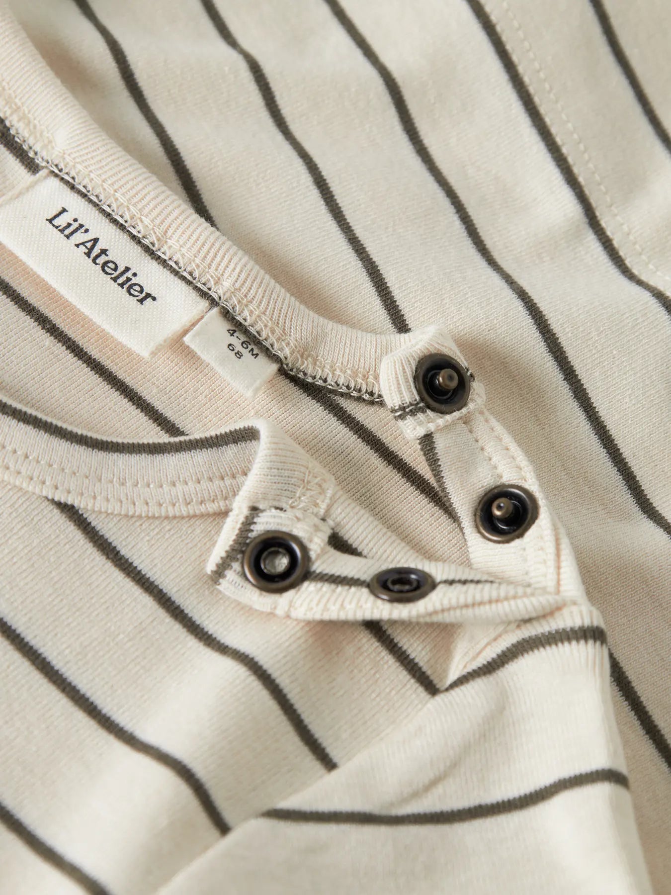 Dieses coole Langarmshirt von Lil' Atelier im lässigen Streifenlook sorgt für gemütlichen Tragekomfort bei euren Kleinsten. Hergestellt aus 57% Bio-Baumwolle, 38% Lyocell und 5% Elasthan, fühlt sich das Shirt superweich an und macht jede Bewegung mit. Die sanfte Farbe Turtledove passt zu vielen Outfits und bringt eine verspielte Note in den Kinderalltag. Perfekt für kleine Entdecker!