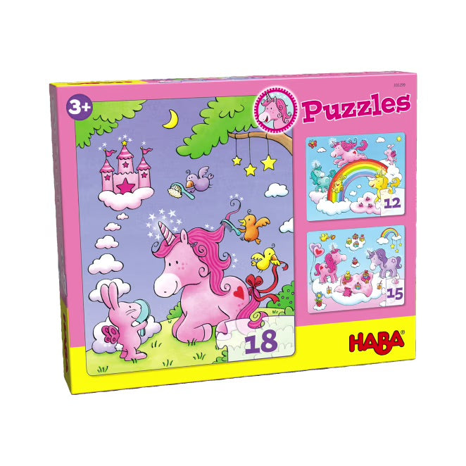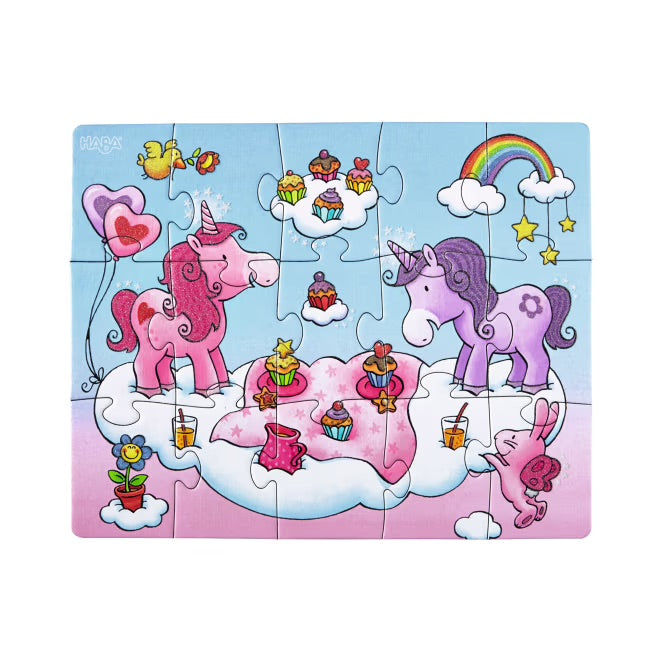 Es gibt Neues aus dem Wolkenland! Die HABA-Puzzles Einhorn Glitzerglück bringen die süßen Einhörner aus dem beliebten und gleichnamigen HABA-Mitbringspiel zurück ins Kinderzimmer. Schon die glitzernde Verpackung lässt Vorfreude aufkommen. Für fabelhaften Puzzle-Spaß sorgen dann drei wunderschön illustrierten Motive, die ebenfalls glitzern. Sie zeigen Glitzerglück beim Galopp über den Regenbogen, beim fröhlichen Picknick in den Wolken und beim abendlichen Plausch mit dem rosa Häschen. Auch mit den Einhornfreunden Sternenstaub, Wunderblume und Zauberherz gibt es ein Wiedersehen. Und dank der unterschiedlichen Anzahl von Teilen reifen Puzzle-Neulinge mit den HABA-Puzzles Einhorn Glitzerglück rasch zu echten Profis heran.