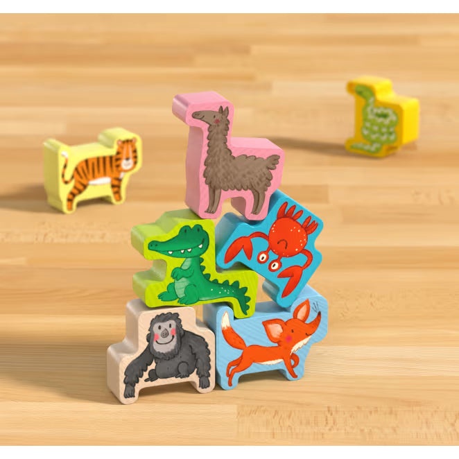 Jetzt wird’s tierisch wackelig! Beim HABA Stapelspiel Meine ersten Spiele – Tier auf Tier Junior stellen sich die Tiere zur großen Pyramide auf. Wer klettert auf wen? Das finden die jungen Stapelkünstler heraus, indem sie würfeln. Doch ob der tierische Turm auch hält, liegt in der Hand der Spieler: In drei Stapelspielen bauen sie Tier auf Tier. So landen das Krokodil auf dem Hund und die Schlange auf dem Affen. Im dritten Spiel liefern sich die Spieler zudem gemeinsam ein Wettrennen mit dem Krebs. Mit Meine ersten Spiele – Tier auf Tier Junior von HABA trainieren die Jüngsten spielerisch ihr Fingerspitzengefühl. Am Ende gewinnt der beste Stapelkünstler.